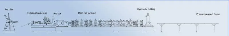 अनकॉइलिंग मशीन → मेन्ड्रेल बनाना → हाइड्रोलिक सिस्टम → स्वचालित नियंत्रण प्रणाली → चरण-दर-चरण बनाने की व्यवस्था → स्वचालित कतरनी तंत्र → तैयार उत्पाद प्राप्त करने की तालिका। मुख्य प्रक्रियाओं में हाइड्रोलिक पंचिंग और हाइड्रोलिक कटिंग शामिल हैं।